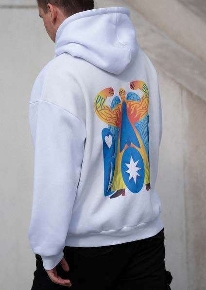 Das Freedom Hoodie von Anna trägt ein verborgenes Symbol: das ukrainische Wappen und das Wort „ВОЛЯ“ (Freiheit). Dahinter steht ein Engel – stark, gerecht und mit brennendem Herzen – als Beschützer:in der Ukrainer:innen. Ein Hoodie voll spiritueller Kraft, Liebe und Mut, der an die Schutzengel der Freiheit erinnert.