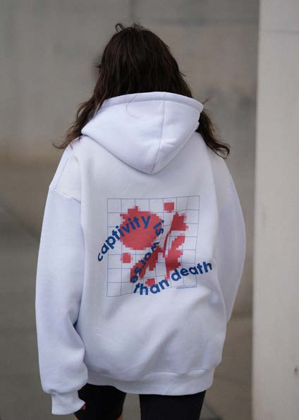 Das Statement Hoodie von Marta basiert auf einem Zitat des berühmten Dichters Taras Schewtschenko. Im Hintergrund erscheinen vereinfachte, verpixelte Blumenmotive – eine moderne Interpretation traditioneller ukrainischer Muster. Dieses Design verbindet Vergangenheit und Gegenwart und erinnert daran, dass Kultur immer ein Akt des Widerstands bleibt. 100 % des Erlöses fließen in humanitäre Projekte von Be an Angel e. V. zur Unterstützung von Ukrainer:innen in Not.